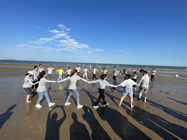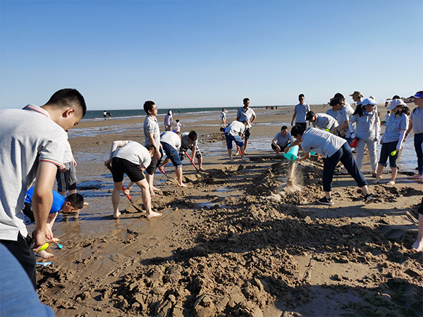 面朝大海,大家你一锹我一铲,齐心协力在沙滩上雕筑下“8xbet体育·(8xbet SPORTS)官方网站”的字样,许下共同的心声——每个人都是一粒沙,但只要勠力同心,便能聚沙成塔!