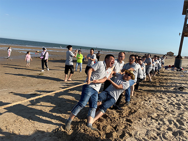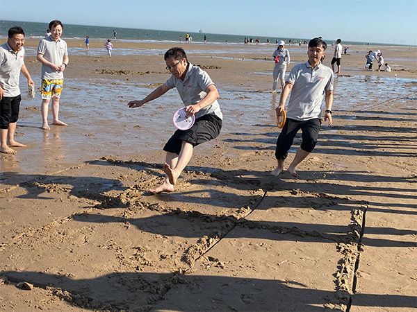 大家在沙滩上玩起了人体呼啦圈、沙滩螃蟹、拔河等娱乐活动,笑声、欢呼声、呐喊声此起彼伏,放松身心、贴近彼此。